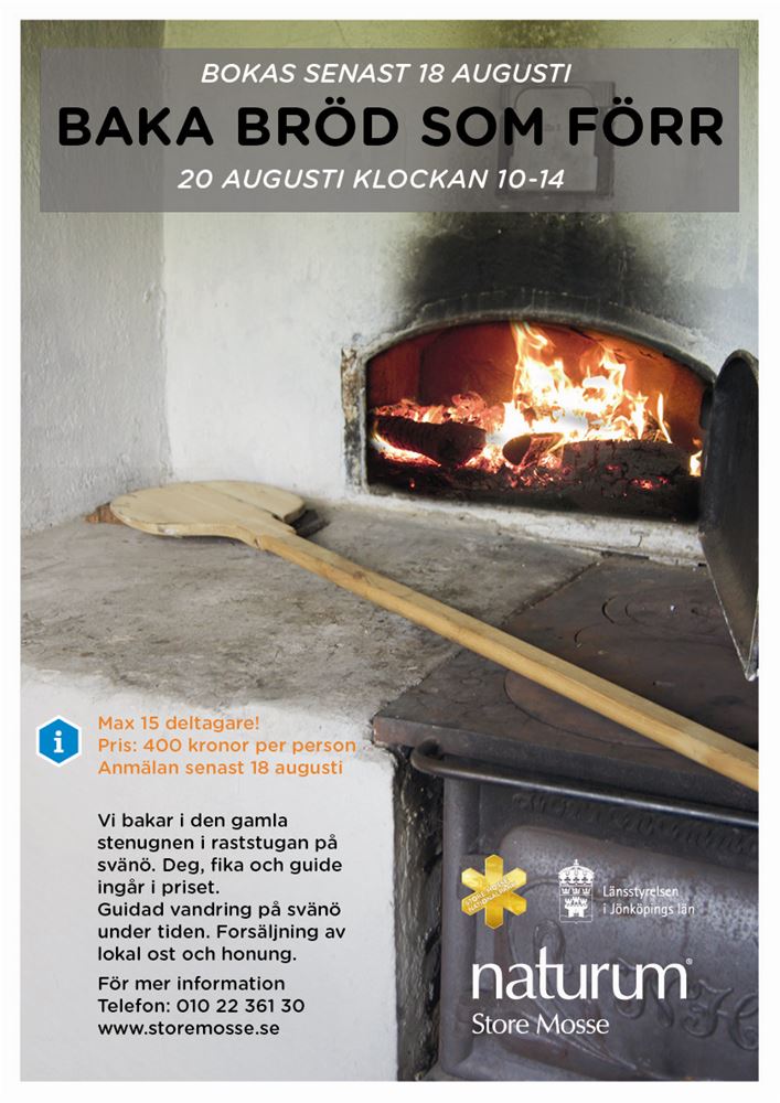 Vi bakar i den gamla stenugnen i raststugan på svänö. Deg, fika och guide ingår i priset. Guidad vandring på svänö under tiden. Försäljning av lokal ost och honung.