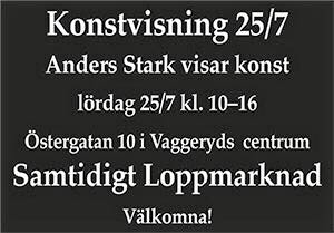 Anders Stark visar konst lördag 25/7 klockan 10-16 på Östergatan 10 i Vaggeryds centrum. Det är också en loppmarknad som pågår samtidigt. Välkomna!